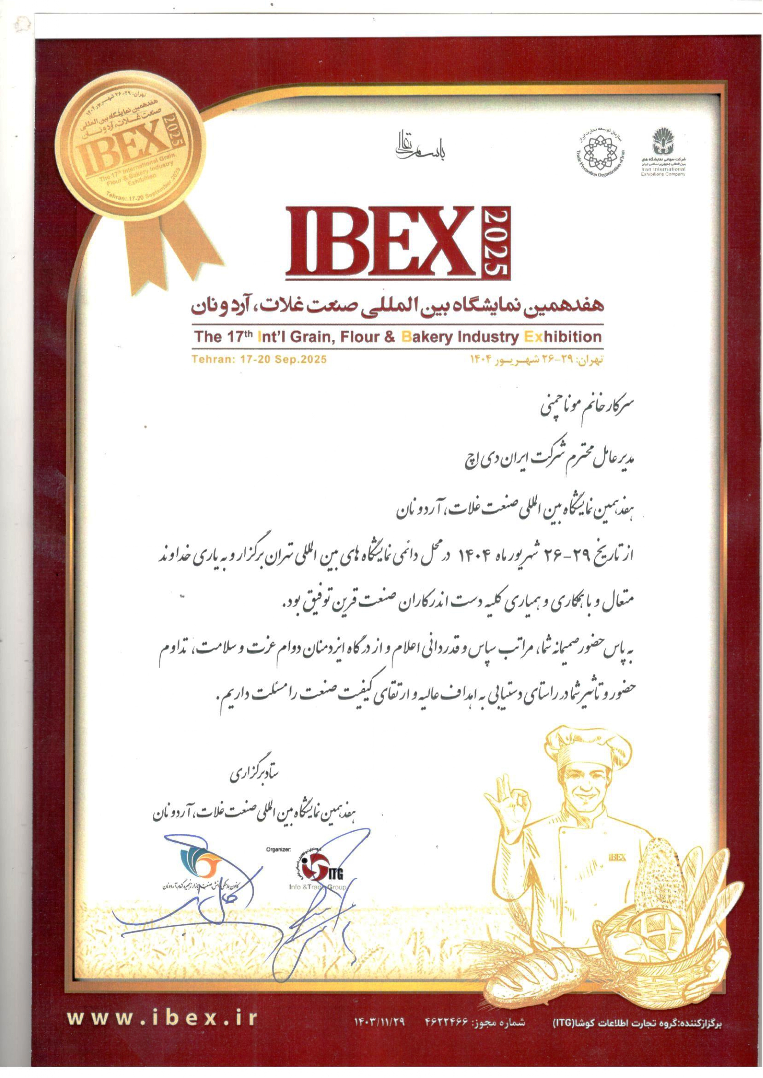 لوح تقدیر هفدهمین نمایشگاه بین الملی غلات، آرد و نان 1404 -